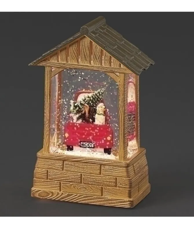 Décor de table, lumière scintillante, grange avec camion et chiens.